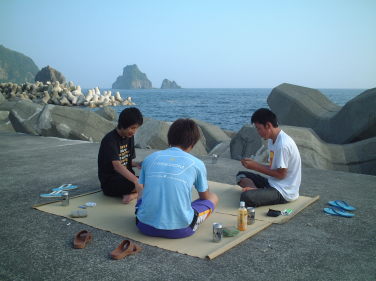 2001年度の夏期合宿は、7月29日から31日にかけて伊豆半島の先端、南伊豆町入間の「民宿・浜隠居」を拠点に挙行されました。浜隠居は往年の若者のあいだでつとに知られた存在ですが、小生も学生時代から25年間通っています。今回は野部研1期生の面々と大自然のなかで時計のない生活をして、頭の中の引き出しを整理し直そうと云う企てです。三日間にわたって海と戯れているうちに、心身共に太古からのリズムを取り戻したようです。
