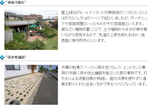 以下に示すように、「シナモニ」ホームページでは、小学校で屋上緑化をしている部分とコンクリート部分での表面温度の違いや、家庭でできるヒートアイランド対策として打ち水を紹介したり、夏休みの自由研究のヒントとなるようにシナモニを用いた自由研究の提案などを掲載した。