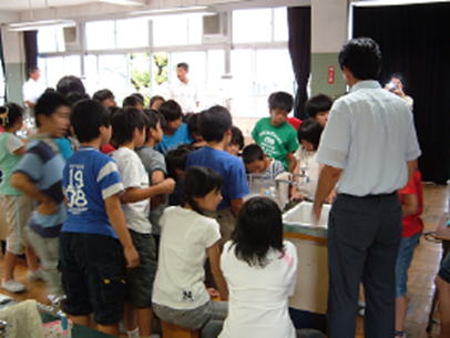 「地球温暖化とヒートアイランド現象」のテーマでは、地球温暖化とヒートアイランド現象のそれぞれの原因、影響、対策等を説明した。ヒートアイランド対策技術として、第四日野小学校でも行っている屋上緑化の効果などを説明し、保水性ブロックの簡易的な実験を行った。普通のレンガと保水性ブロックの比較検証を行い、含水量の違いに児童が大きく興味を持って観察していたことが印象に残る。