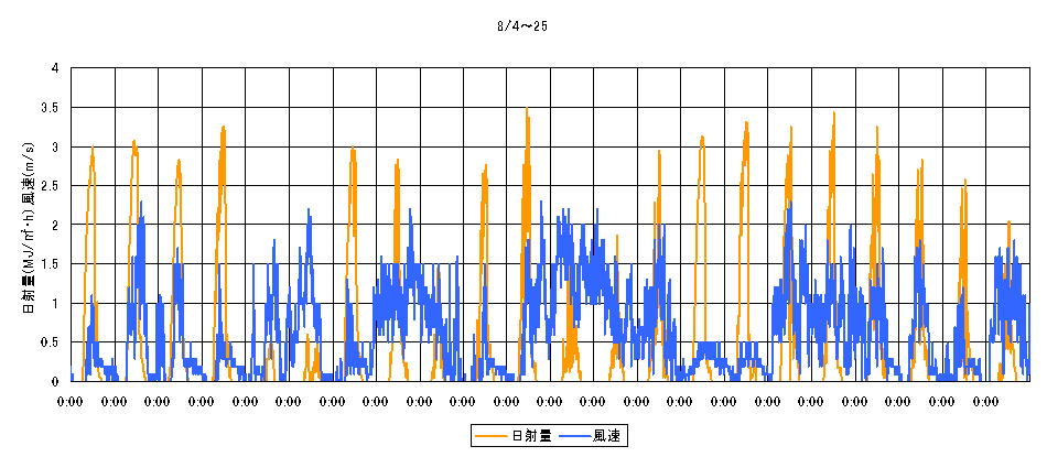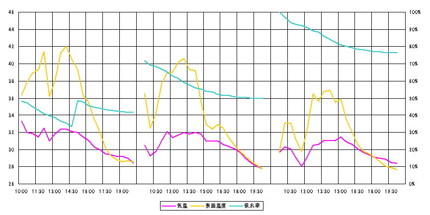 これを見ると、蒸発量の大きさによって温度上昇が影響を受けていることが分かる。21日では、朝から昼頃までは水分蒸発とともに温度上昇を抑制していたが午後にはほとんど効かなくなり、15時に再度散水をして再び温度低減効果が発揮されている。