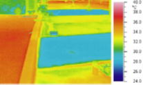保水性ブロックとダスト舗装・コンクリートの1時間おきの熱画像を示す。舗装材の道路寄りの部分(画像の右端部分)のみに9:45頃に散水を行った。10:00から13:00までの時間帯を見ると、この散水した部分の温度が4〜7℃程度下がっており、蒸発冷却効果が現れている。