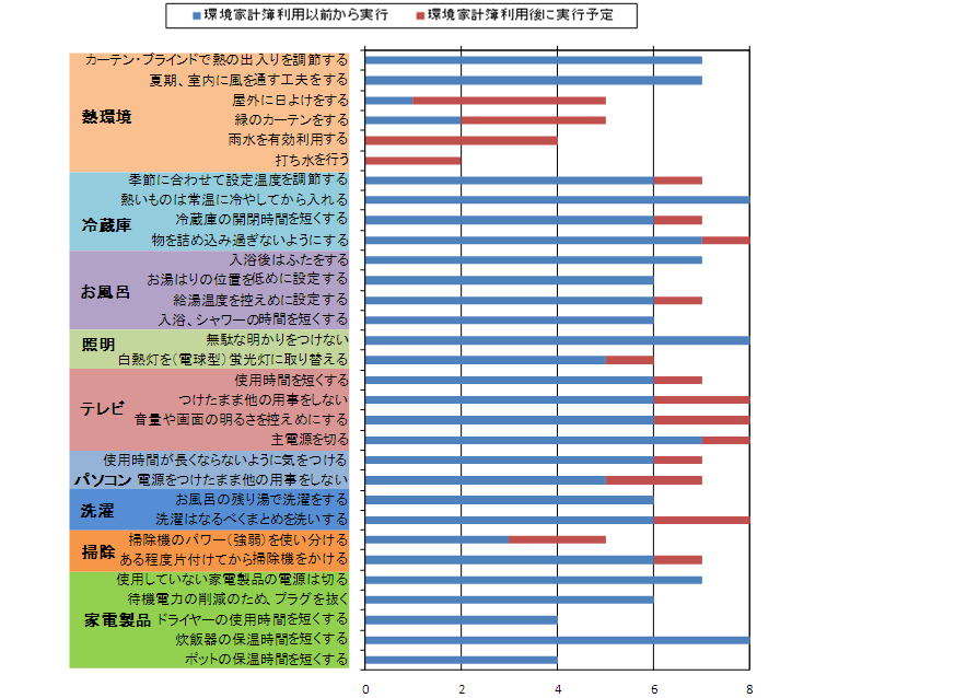 モニター世帯に対し、省エネ行動に関するアンケート調査の回答を求めたところ、有効データ世帯数は8世帯となった。各世帯での環境家計簿利用以前から実施している省エネ行動と、環境家計簿利用後に実施してみたいと思った省エネ行動を図6.3-1に示す。
