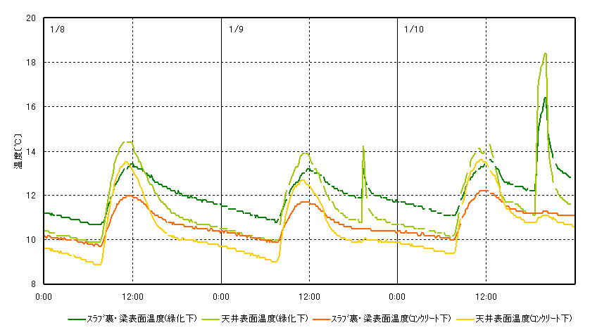 屋上緑化の効果を検証するため、シナモニでは第四日野小学校の屋上緑化部分とコンクリート部分の表面温度だけでなく、それぞれの直下階の温湿度、スラブ・梁表面温度、天井表面温度を計測している。