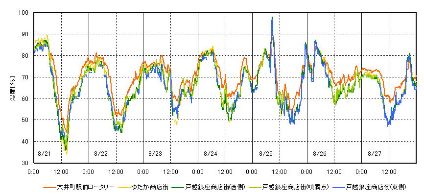 戸越銀座商店街では、今年度の東京都のヒートアイランド対策事業の一環でドライミストを設置している。このドライミストは7月から9月までの3ヶ月間稼動する。シナモニではこのドライミストの効果を検証するためにドライミストの周辺の温湿度を計測している。