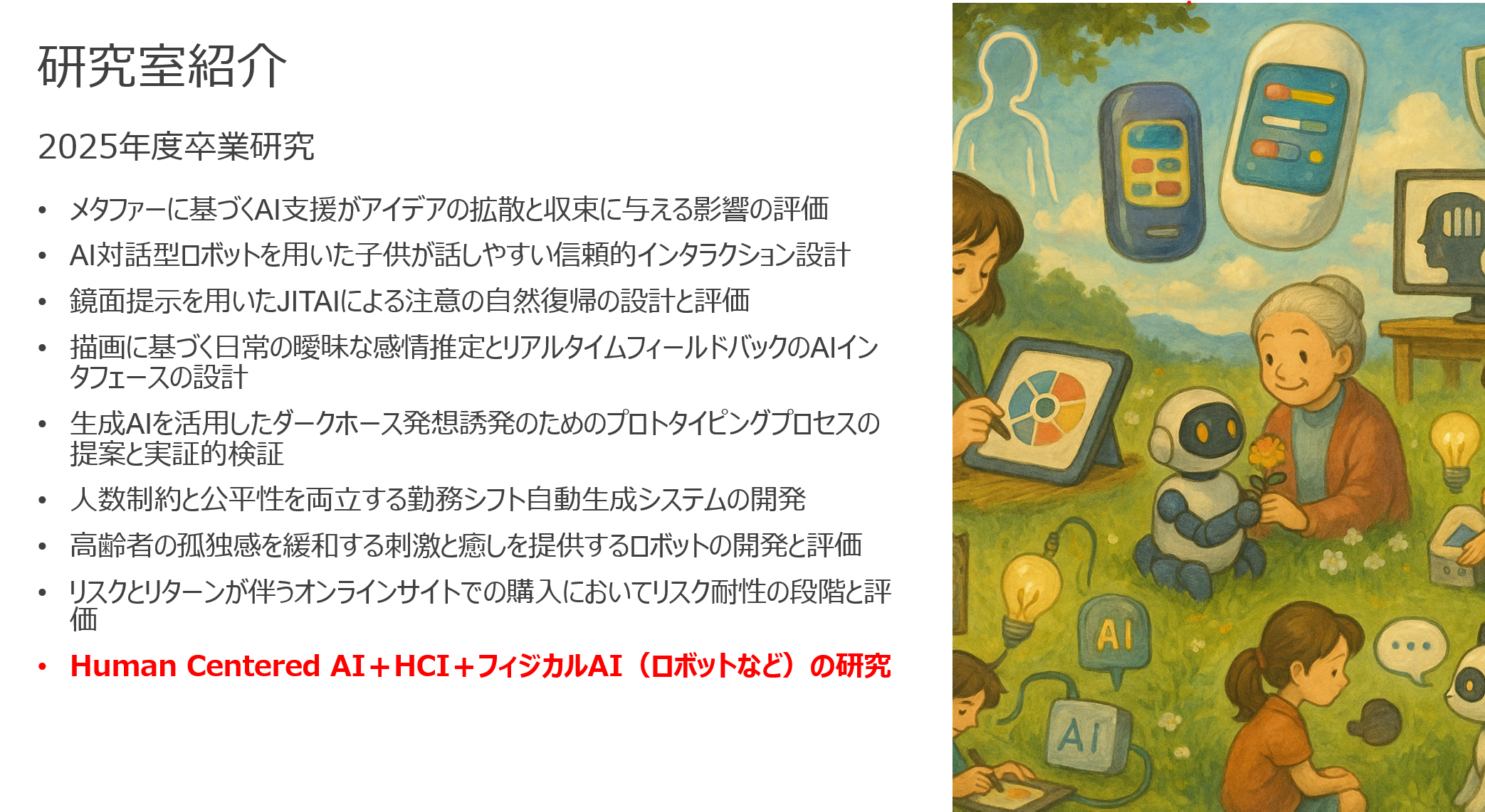 Our laboratory conducts research to support the design and development of mechanical systems such as autonomous vehicles and robots, focusing on collaboration between humans and AGI (Artificial General Intelligence). We also explore user interfaces using virtual reality (VR) technology.