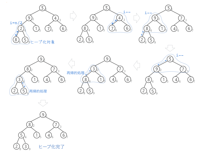 - 交換した子ノードに移動して、親ノードとなる。親ノードの方が子ノードよりも小さいか、もしくはリーフに到達するまで手順(3)を繰り返す。すべてのノードを取り出したら終了する。